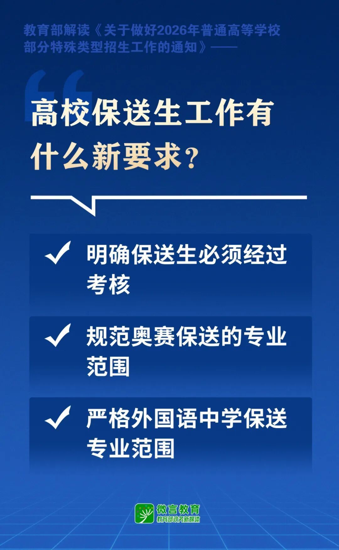一是明确保送生必须经过考核。要求有关高校根据办学定位及相关专业人才培养需要,严格制定保送生考试工作方案,精心设置保送生考核内容及录取标准,不得简单以提交材料审核代替线下考核。
