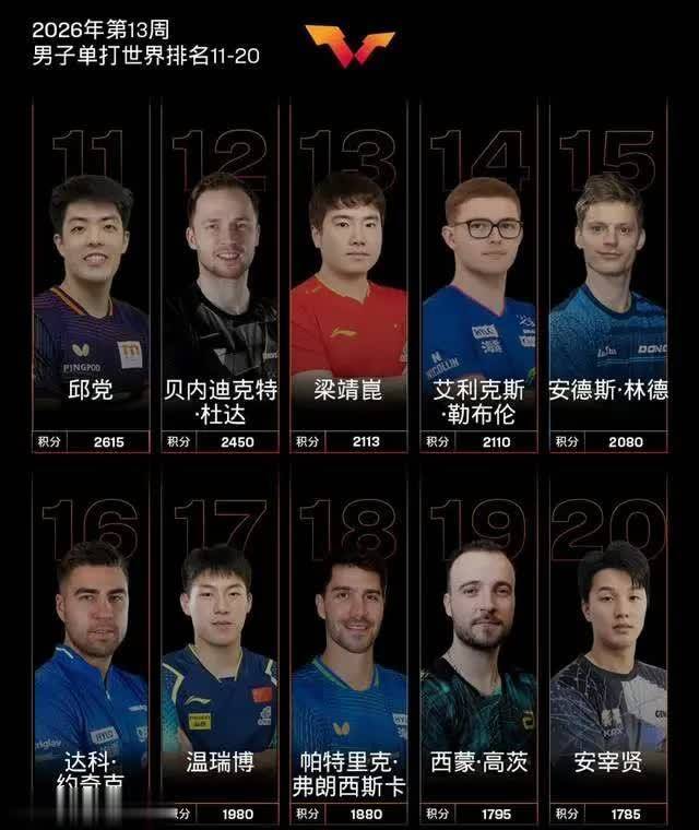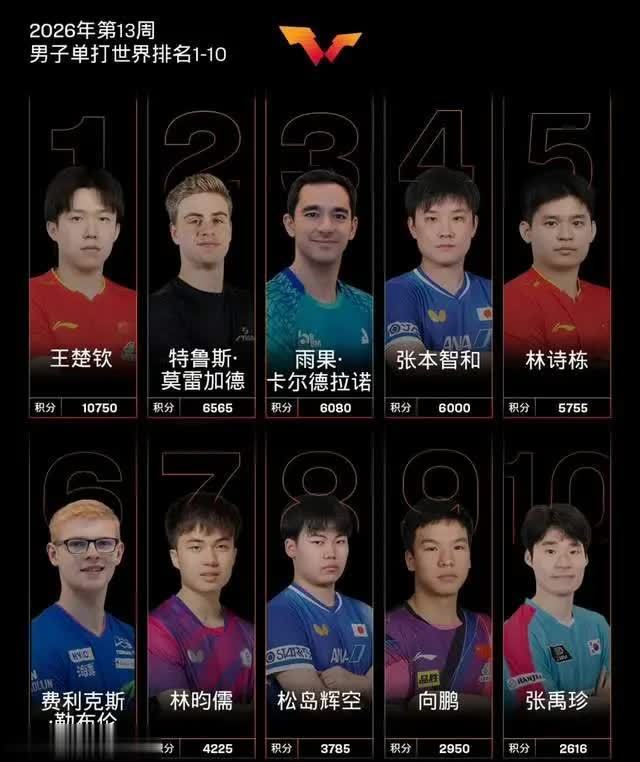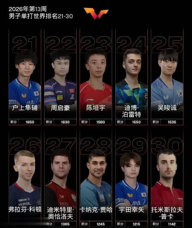 北京时间2026年3月24日消息。今天上午,WTT国际乒联公布了第13周的世界男单排名情况。目前,中国队正在成都进行封闭集训,以备战月底的澳门单打世界杯,以及下个月的英国伦敦世乒赛。